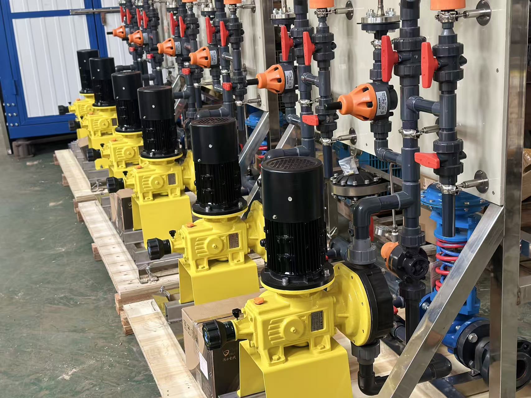 精準(zhǔn)投加階段:經(jīng)過壓力調(diào)節(jié)的液體分別輸送至 2 臺(tái)計(jì)量泵,操作人員可通過計(jì)量泵自帶的調(diào)節(jié)手輪,在 0-100% 流量范圍內(nèi)靈活、精準(zhǔn)調(diào)控投加流量,滿足不同工況下的投加需求;同時(shí),每臺(tái)計(jì)量泵均配套專屬電磁流量計(jì),實(shí)時(shí)監(jiān)測對應(yīng)管路的投加流量,便于操作人員及時(shí)掌握運(yùn)行狀態(tài)并調(diào)整參數(shù)。