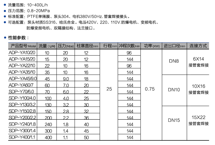 標準配置:PTFE單隔膜、泵頭304、電機380V/50Hz. 管套焊接接頭